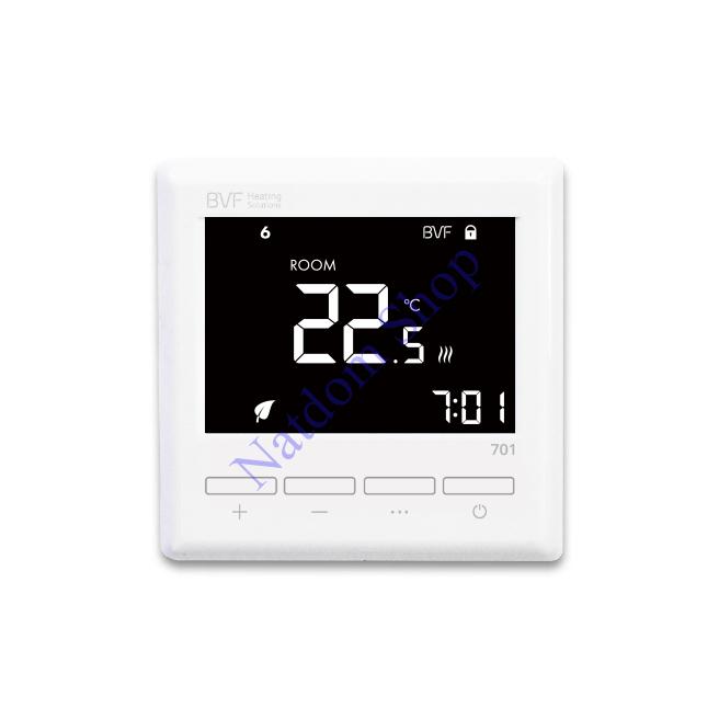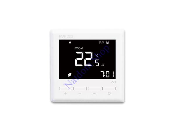 - A BVF 701 programozható szobatermosztát alkalmas minden típusú elektromos fűtés és elektromos padlófűtés vezérlésére. A BVF termosztátokra jellemző nagy teljesítményű teljesítménykapcsolóval szerelt hátoldal extrém igénybevétel mellett sem melegszik fel, valós hőmérséklet érzékelés pontosabb mint valaha.