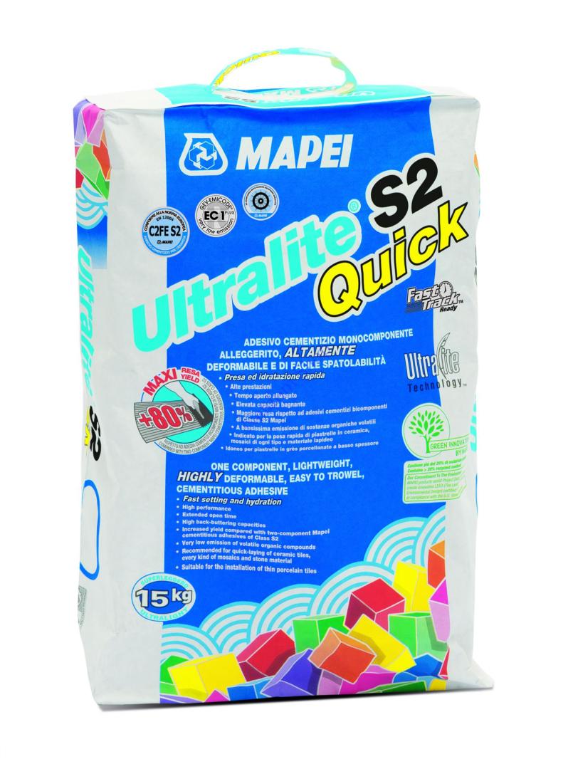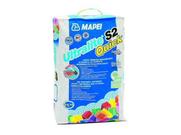 A Mapei Ultralite S2 Flex Quick egy könnyűsúlyú, gyorskötésű, nagy alakváltozásra képes cementkötésű ragasztó, amelyet kifejezetten kerámia, mozaik és kő burkolólapokhoz fejlesztettek ki. A termék ideális nagy formátumú burkolólapokhoz, padlóra és falra egyaránt, beleértve a kültéri homlokzatokat is.